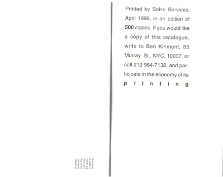 Book: 8 ¼ x 11 ¾ inches (oblong). One black and white illustration. [18] pp. Stapled in the upper left-hand corner, photocopied in an edition of 250 copies.