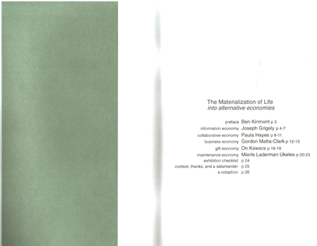 First Separate Edition, first issue. Texts from a student workshop organized with third and fourth year students at L’École régionale de beaux arts de Valence. First published in 2006 bound dos à dos with another work. This edition printed at the Kadist Art Foundation in Paris for the show Prospectus: Paris. In French and English. 107. MATERIALIZATION of life into alternative economies. Paris edition: towards project art and sustainability. Paris: Antinomian Press, [2 April] 2011.