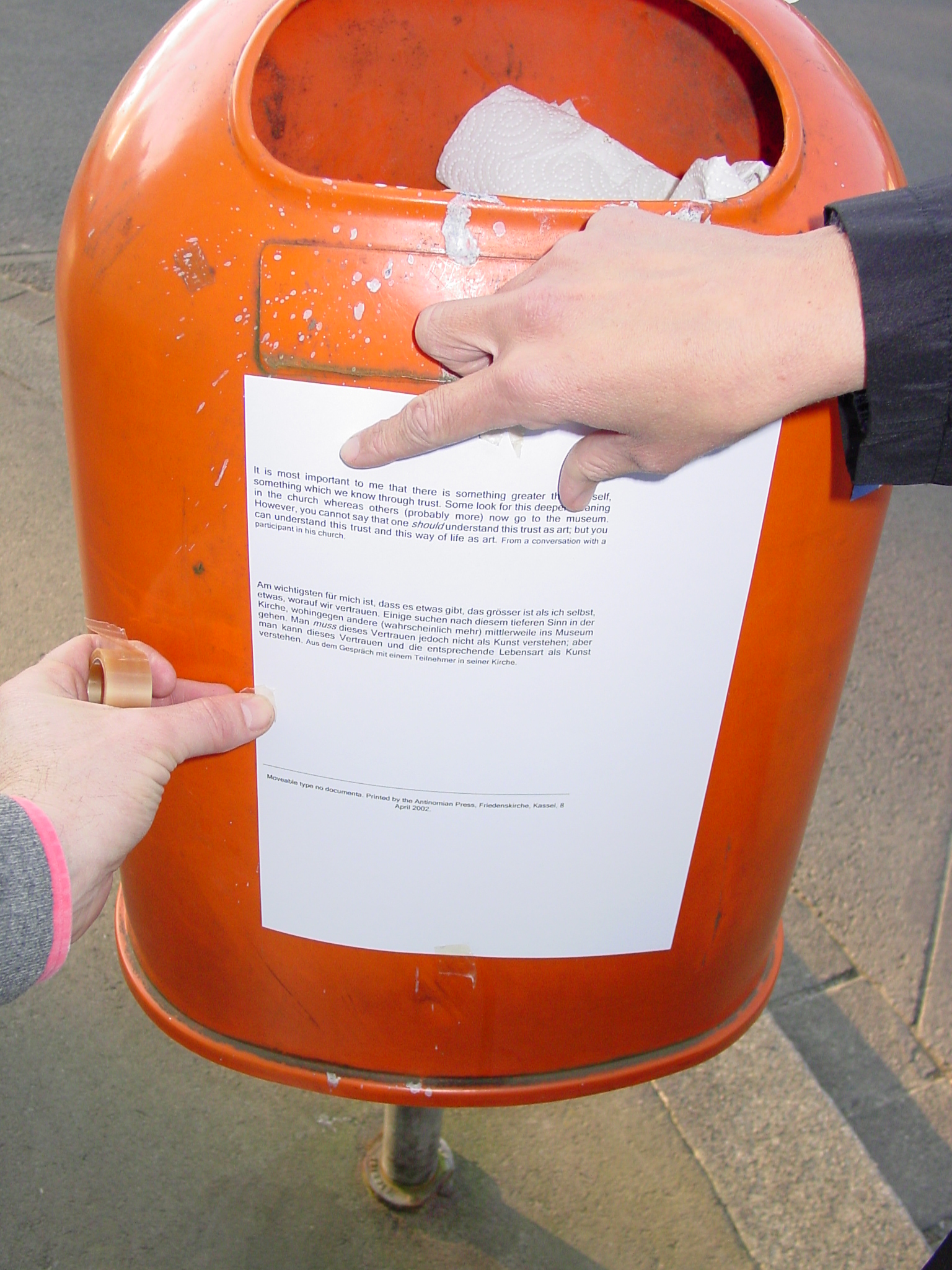 FIRST EDITION. From a conversation with a participant in her office. Printed with a battery-operated printer in the Kassel town hall, Germany, and distributed in the surrounding neighborhood on the same day. Part of Kinmont’s project Moveable type no Documenta for Documenta 11. In English and German. 23. IT IS most important to me that there is something greater than myself, something which we know through trust. Kassel: Antinomian Press, 8 April 2002.